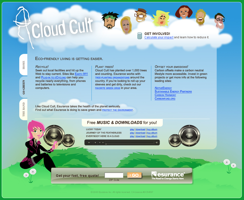 Because the band and Esurance sought to encourage consumers in safeguarding our environment, all components in the campaign pointed to a themed micro-site where consumers could get educated about going green, learn about the band, and get free downloads of some of Cloud Cult’s music.